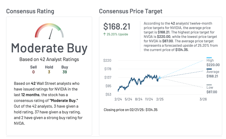 华尔街多数分析师仍然对英伟达表达了乐观的前景。目前,华尔街平均目标价为168.21美元,较当前英伟达的股价有将近25%的涨幅,其中最高目标价达到220美元,最低目标价为87美元。